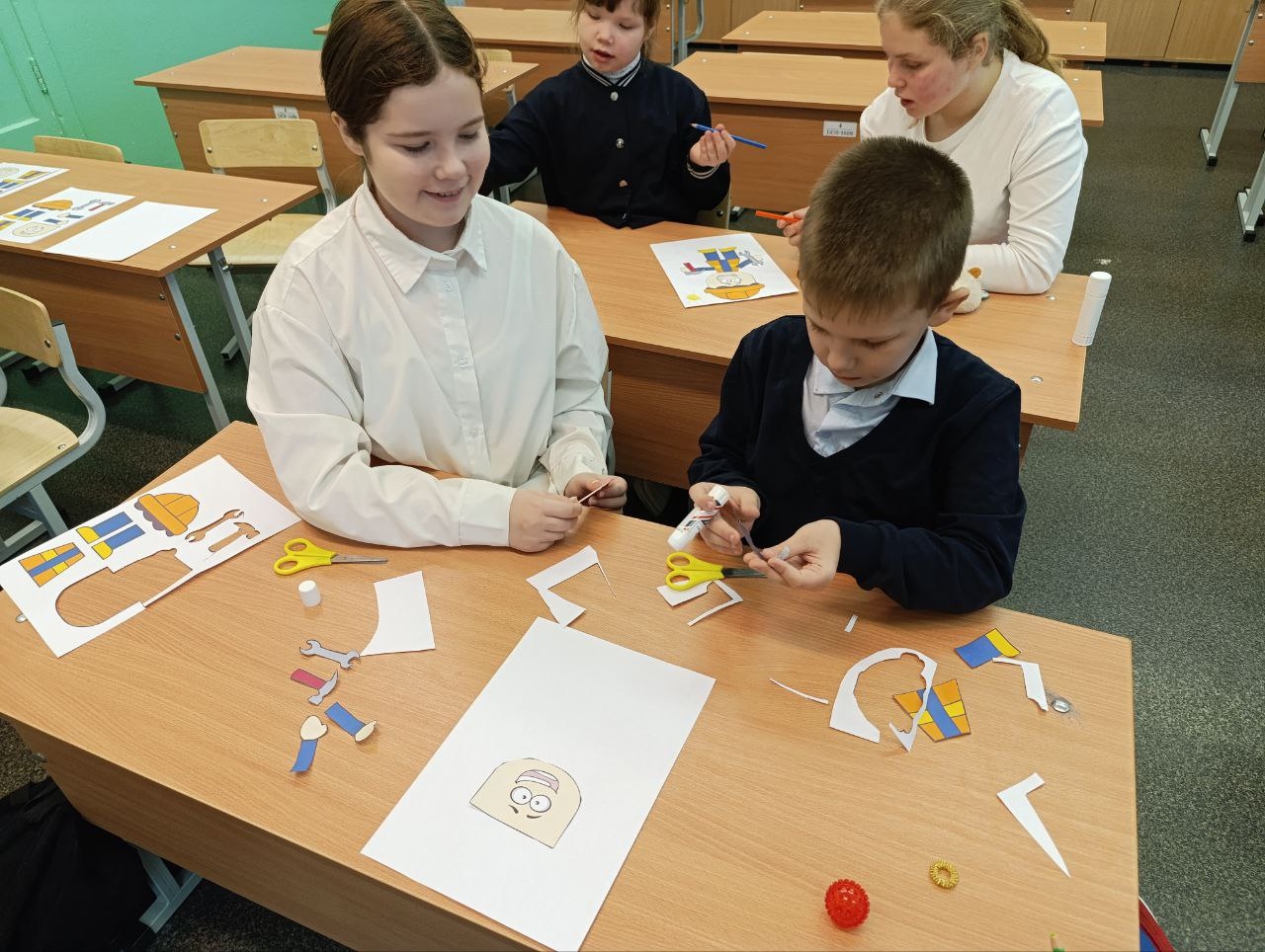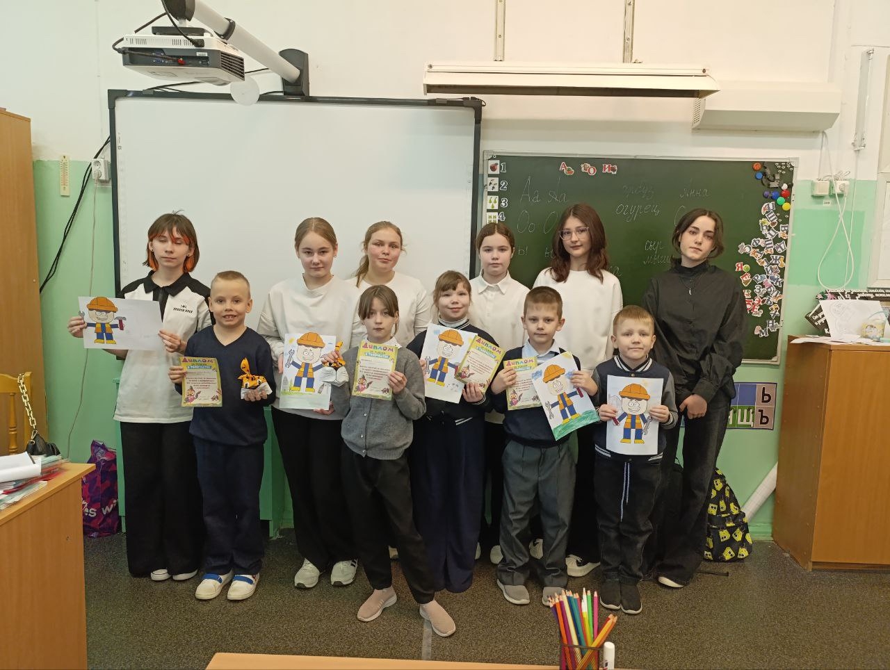 Первоклассники активно участвовали в занятии, старались точно повторить предложенный образец, проявили чудеса фантазии и внимания. Результатом стала целая коллекция ярких и красочных изображений строителей, выполненных собственными руками юных художников.