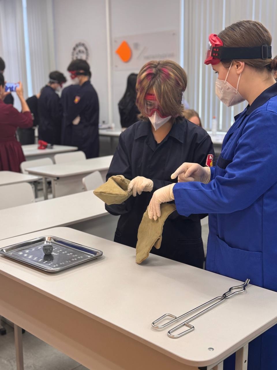 Экипировка: Что носит современный металлург? Конечно, защитный костюм! Наши ученики примерили спецодежду и почувствовали себя настоящими профессионалами, стоящими у плавильных печей.